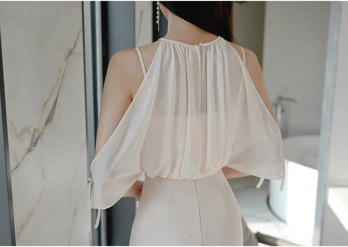 Chiffon material, light and elegant, great touch. The design of the fake two pieces is unique and fashionable, making you stand out in an instant. The style of shoulder-slipping splicing cleverly modifies the shoulder lines. The waist design shows a slimming effect, highlighting your small waist. The version of the hip skirt shows attractive curves, sexy and elegant.